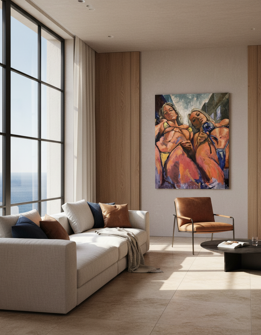 This painting by Willem van der Krieken is a striking and provocative work that explores the themes of femininity, sexuality, and power. The central figure is a woman wearing a black bikini, her body painted in a bold and geometric style. The woman's face is obscured, leaving her identity a mystery.